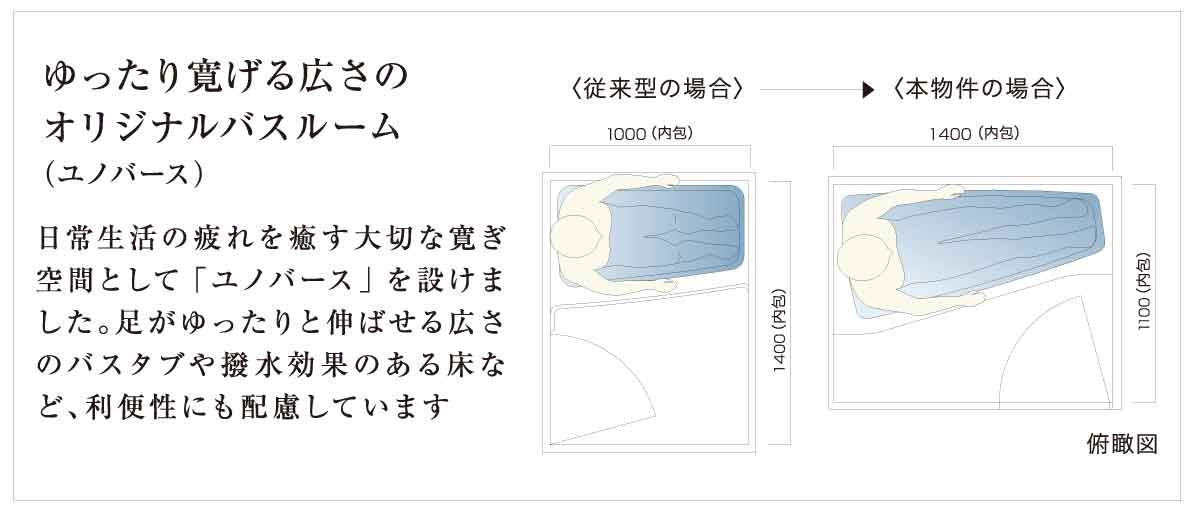 日常生活の疲れを癒す大切な寛ぎ空間として「ユノバース」を設けました。足がゆったりと伸ばせる広さのバスタブや撥水効果のある床など、利便性にも配慮しています。