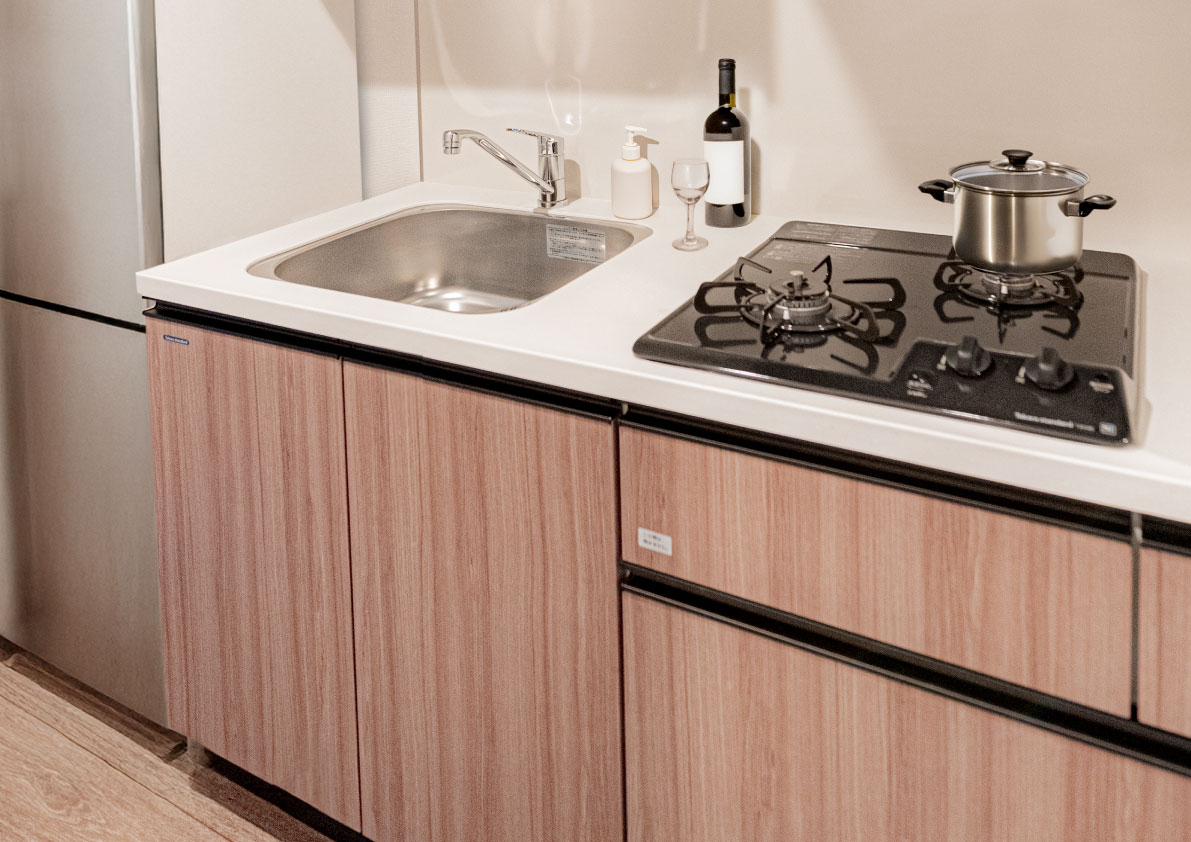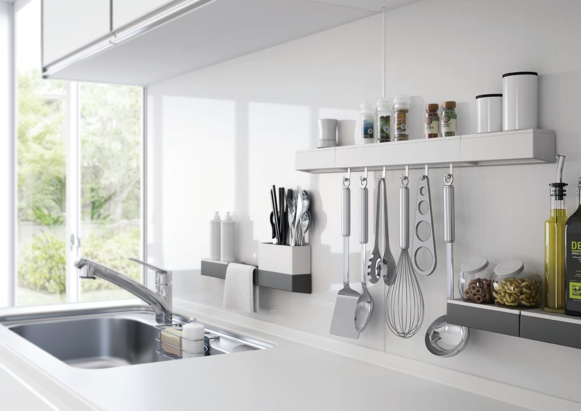 キッチンの壁一面には、マグネットが付くホーローキッチンパネルを採用。収納機器の付け外しが簡単で、壁に穴を開けることなく自分好みの空間を創出できます。