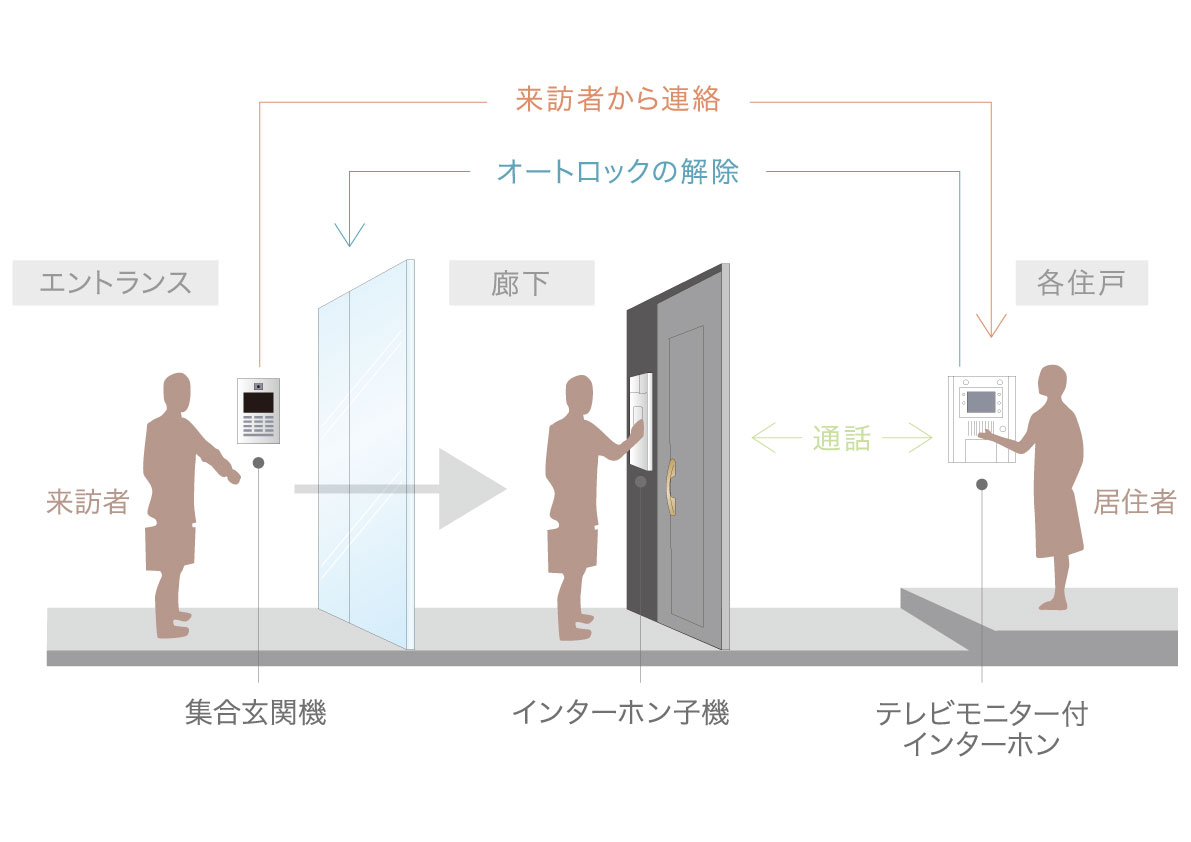 部屋に設置されたモニターで、相手を確かめてからエントランスのロックを解除でき、安全性を高めます。多様化する都市の犯罪を未然に防ぐ、優れたセキュリティシステムです。