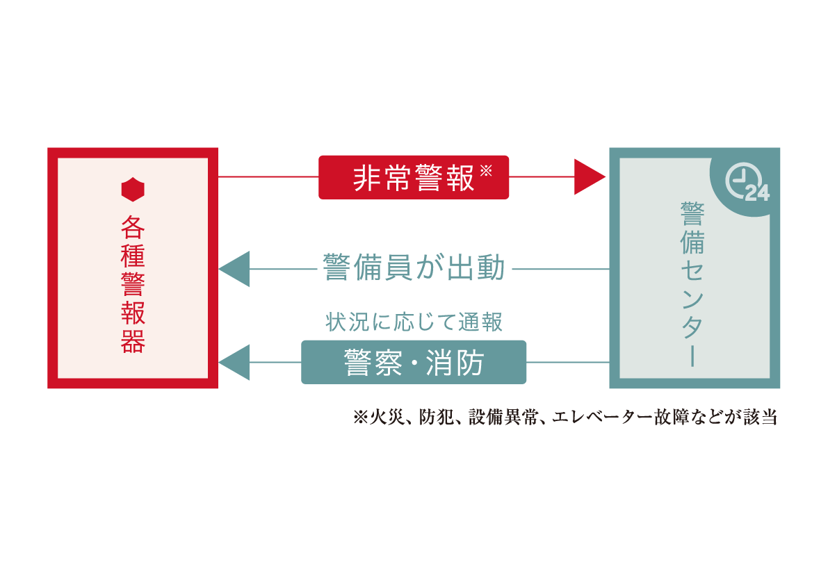 建物内に設置された各種警報器の異常信号を24時間管理。非常事態が発生した時には、いつでも警備員が出動できる体制が整っています。